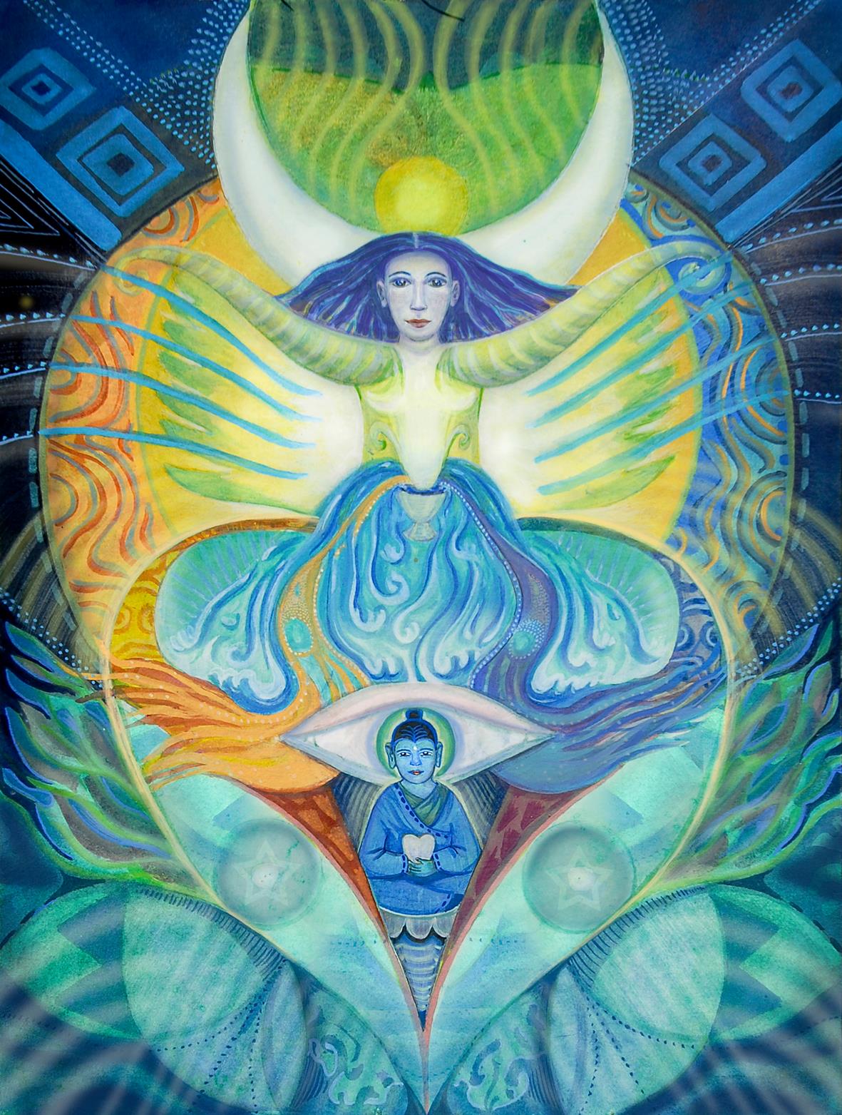 Sometime ago in different sessions with people while counseling or guiding, I started to sketch (later the sketch becomes a painting) on beings or guides who were supporting them in that present and moment in life. Sometimes these energies and powers take a very clear form and others are abstract. Usually the mandala-shaped images are like a scan of that persons energy and are very helpful for meditation and can aid personal healing.